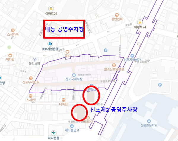 주차장은 내동 공영주차장과 신포제2 공영주차장이 있습니다.