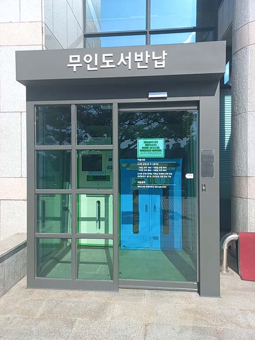 도서관 입구에 무인도서반납함도 있어 공휴일이나 도서관 운영시간이 아닐 때에도 반납이 가능합니다. 파란색 반납함에 책을 넣으시면 됩니다.