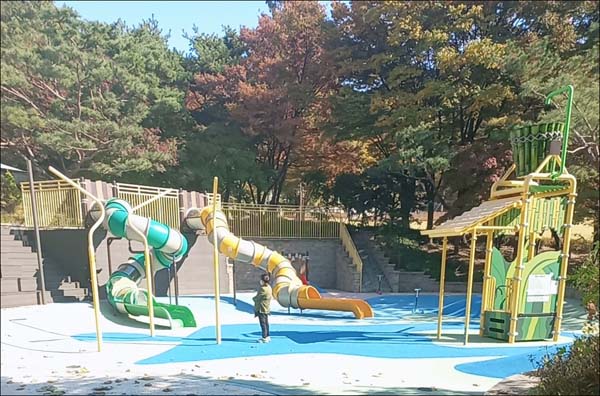 22년도에 새로 만들어졌으며 높은 미끄럼틀 2개가 아이들에게 인기입니다. 높이에 비해 겁 많은 4세도 재미있어하며 여러 번 탑승하였습니다. 주변에 돗자리를 깔고 앉거나 계단에 앉아서 아이들이 노는 것을 구경할 수 있습니다.
