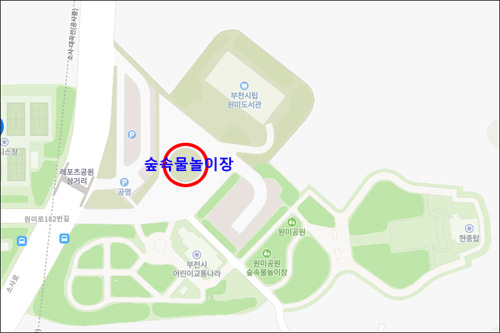 지도에는 어린이 교통나라 오른쪽에 있지만 실제로는 원미시립도서관 바로 앞에 위치하고 있습니다.