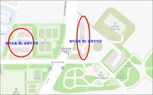 원미공원 제1 공영주차장, 원미공원 제2 공영주차장이 있습니다. 제2주차장이 부천시립원미도서관 바로 앞에 위치하고 있어 가까우나 주차장이 작은 편이어서 금방 만차가 될 수 있습니다.