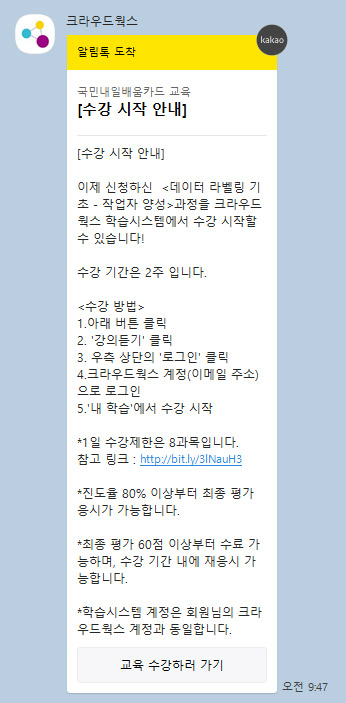 수강신청이 완료되면 카카오톡으로 온라인 수강신청 결과가 안내되고, 교육 시작날이 되면 또 카카오톡으로 교육시작 알림이 옵니다.