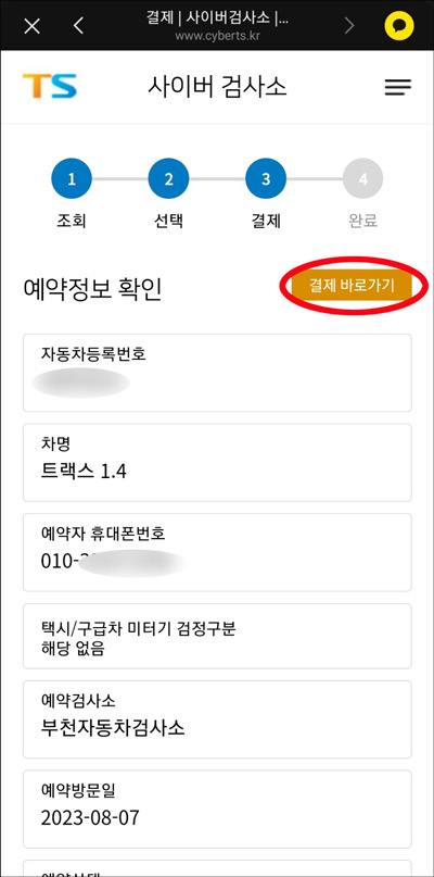7. 예약정보를 확인하고 [결제 바로가기] 버튼